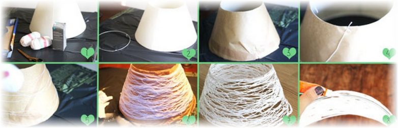 Таким образом, нитки не будут прилипать к абажуру, и можно будет положить его на стол, как только работа будет завершена. Нужно использовать степлер или ленту для крепления бумаги к абажуру.