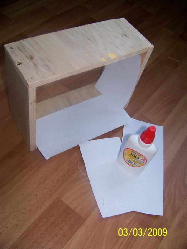 прикручиваем петли на маленькие саморезы, предварительно подобрав под саморез сверло, сверлим дырочку… это делается для того чтоб фанеру саморез не расколол. После приклеиваем тесьму.