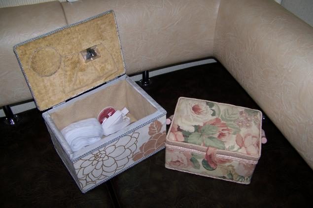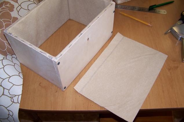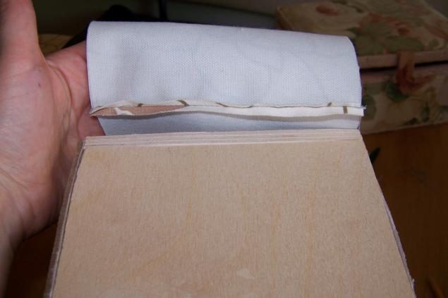 крепим ткань к внутрененним бокам заготовки, потом прижимаем оргалитом кусок ткани, который идет на дно шкатулки