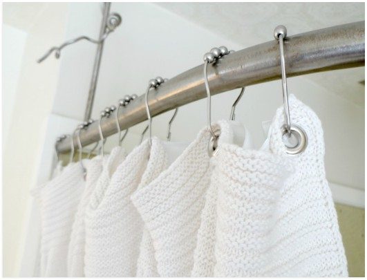 Ваша ванная комната, скорей всего, наименее вероятное место, где текстура занимает центральное место в дизайне. Эта трикотажная занавеска меняет представление о шторках в ванную с ног на голову. Вязаная штора с необычными крючками делает пространство ванной комнаты необычным и уютным.