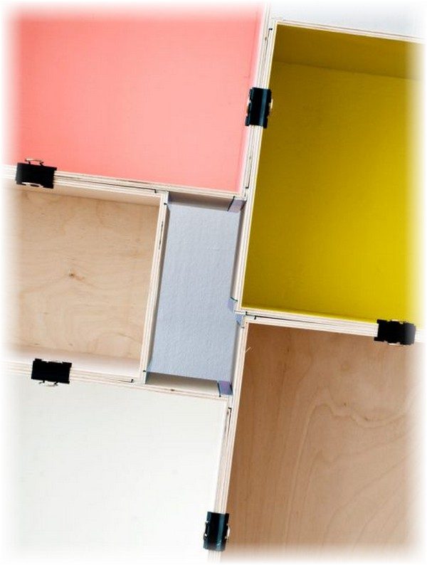 Оригинальный стеллаж, в стиле кубизма, из простых картонных коробок сделать совсем не сложно. Можно с легкостью создать неправильную форму стеллажа, а для того, чтобы обеспечить стабильность полки соединены как горизонтально, так и вертикально простым черным металлическим зажимом.