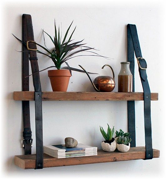 А этот стеллаж создан благодаря переработанной древесине, и паре ремней, которые, возможно уже давно лежали без дела.