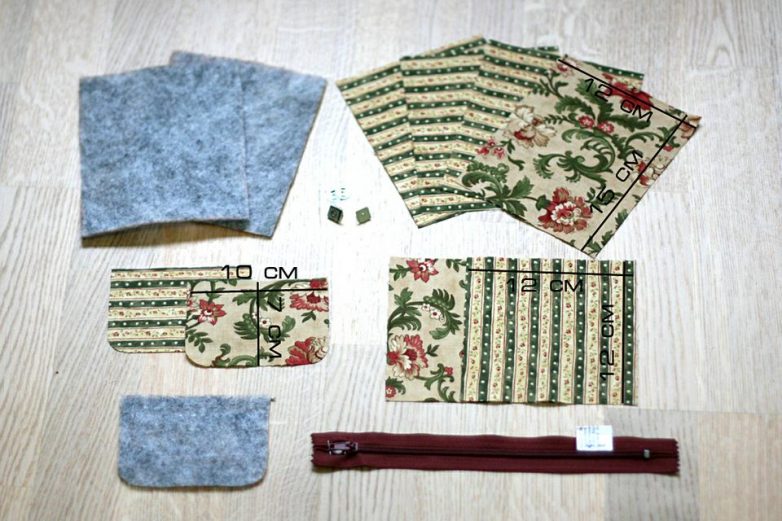 Из хлопка и уплотнителя выкроим детали по указанным на фото размерам. Всего понадобятся 4 прямоугольника 15 см на 12 см, два квадрата 12 см на 12 см, и две детали для клапана 10 см на 7 см со скругленными углами. Из уплотнителя нужны будут две детали 15 см на 12 см и одна для клапана.