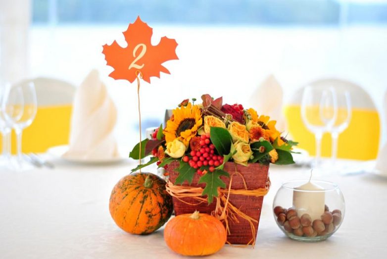 Практически в любой осенней композиции фигурируют тыквы. На них можно вырезать узоры, а если отделка будет касаться только внешней поверхности, то это не помешает потом сделать начинку для пирога. При этом, тыквы вовсе не обязательно должны быть связано с тематикой страшилок к Хэллоуину.