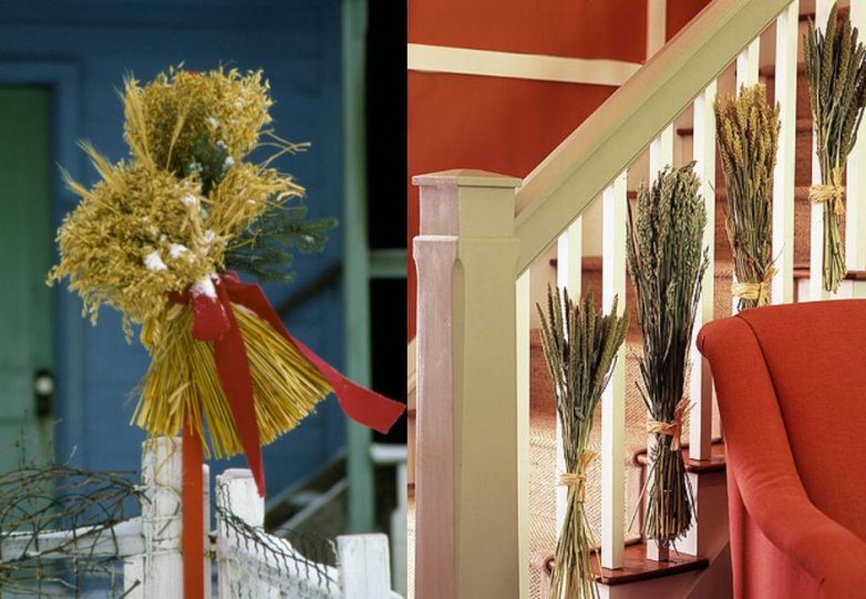 Снопы колосьев, перевязанные тесьмой, можно прикрепить к балясинам лестницы, дверям, забору и куда вам только вздумается.