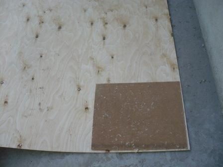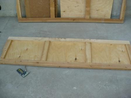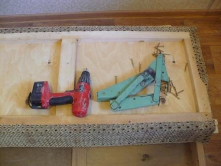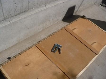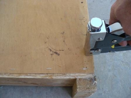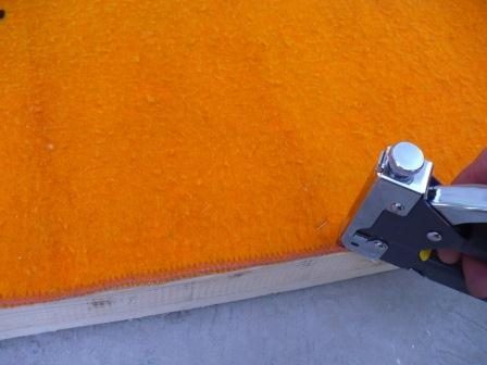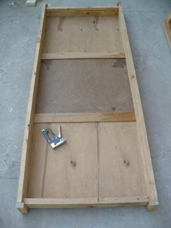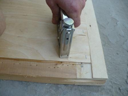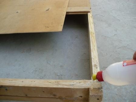 Крепим фанеру к каркасу. Вначале каркас промазываем универсальным клеем, затем прикладываем фанеру и крепим скобами при помощи степлера.