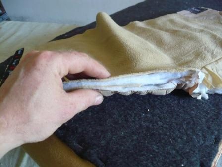 Натягиваем заранее выкроенный с помощью шаблонов и сшитый чехол, и крепим с обратной стороны к основному каркасу.