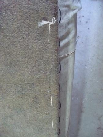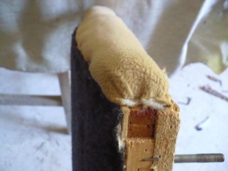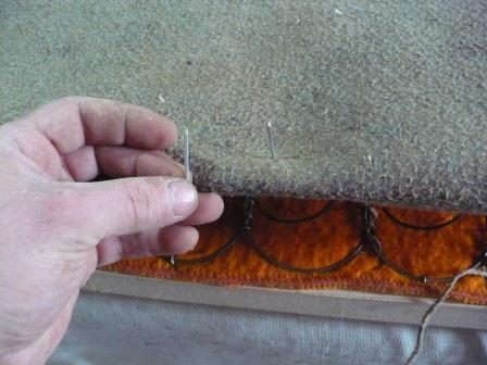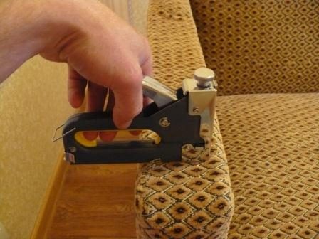 Перетягиваем боковины дивана. Вначале с двух сторон крепим пальтовую ткань.