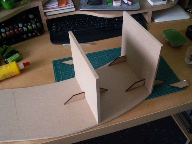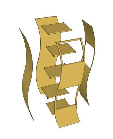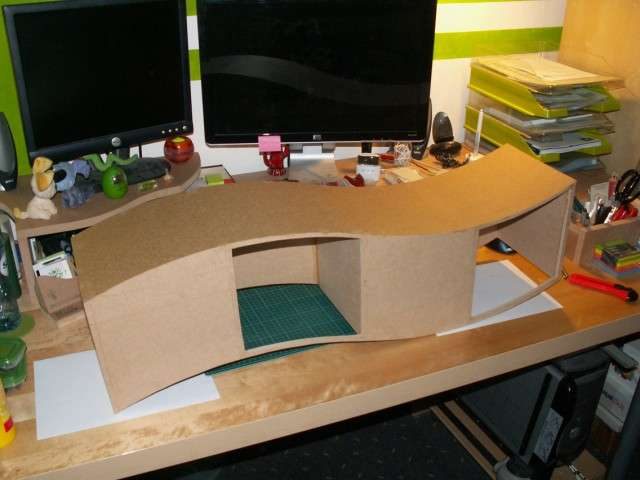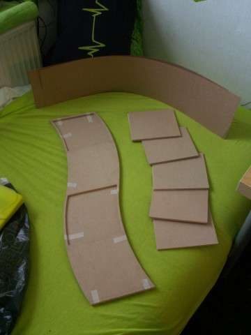 5. Вырежьте две полосы из тонкого ДСП шириной 220 мм. Приложите полоски к искривленным граням передней и задней стенок, добиваясь плотного контакта по всей длине. Так вы определите длину полос для боковых стенок. Отрежьте лишнее. Разметьте положение полок и осторожно выпилите проемы в тонком ДСП, не забудьте по бокам оставить каемку такой толщины, чтобы она закрыла торцы передней и задней стенок.