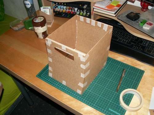 7. Когда клей, соединяющий элементы каркаса, просохнет, можно устанавливать боковины. Лучше всего начать со стенки, в которой нет проемов. На торцы передней и задней стенок нанесите клей, уложите вдоль заготовки из тонкого ДСП, зафиксируйте их на месте с помощью струбцин или малярного скотча. Дайте клею просохнуть.