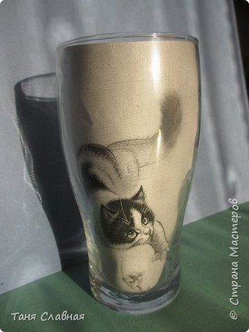 Позади котенка, на другой стороне бокала, я нарисовала траву. Так как рисунок виден со всех сторон, то на просвет изображение кажется объемным.