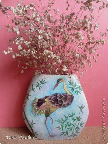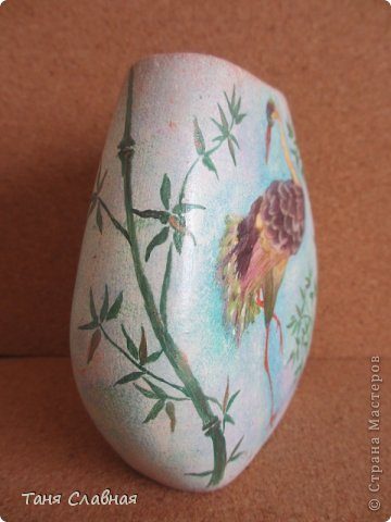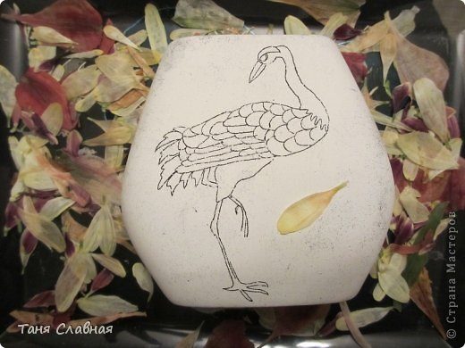 Еще одна птичка — журавлик, появился на этой плоской фаянсовой вазочке,