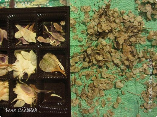 У меня осталось немного сухих лепестков хризантем, которые я использовала в предыдущих работах, и к ним добавились чУдные, маленькие цветочки от гортензии. Они засохли сами по себе, я только собрала соцветия…