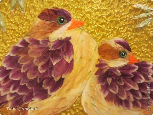 Вся грудка и животик птичек — выложены внахлест бежевыми лепестками хризантем,