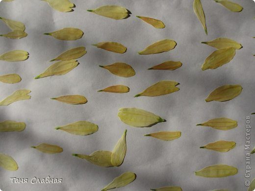 Раскладываю на писчей бумаге отдельные лепесточки, в данном случае- лепестки от хризантемы