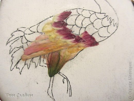 Выложила перышки на крыльях, внахлест, аккуратно располагая лепесточки один над другим.