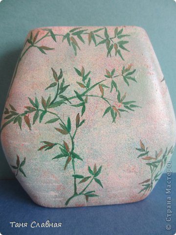 С обратной стороны, по бокам и спереди красками нарисовала нечто, отдаленно напоминающее бамбук. Отдельные листочки прорисовала золотой краской, но фото не передает, как бликует это золото…