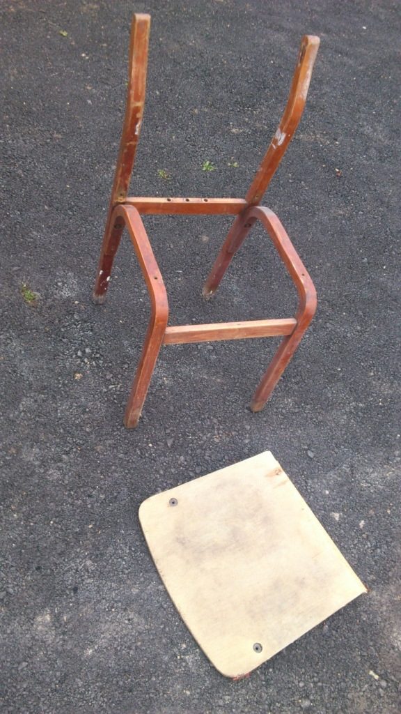 Сначала откручиваем сиденье и спинку (если есть) от каркаса. Затем с помощью наждачной бумаги зачищаем все детали каркаса, снимая старый лак, чтобы потом стул можно было заново покрасить и покрыть новым лаком.