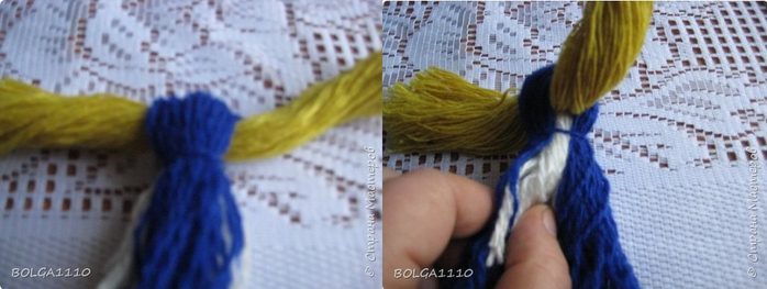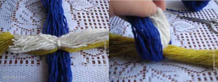 Наложить на грудку и зафиксировать. Накладываем на спинку. Поднимаем белые нитки вместе с синими и завязываем.