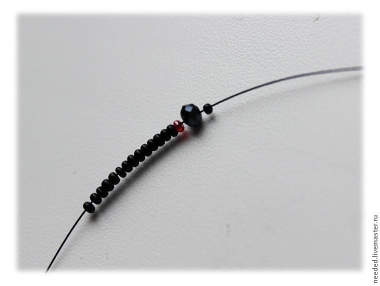Набираем на проволоку ( у меня черного цвета, можно и стального) 15-20 бисеринок, 1 бусину-кристалл и в конце еще 1 бисеринку.
