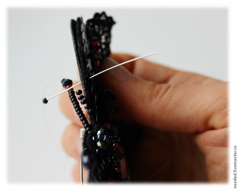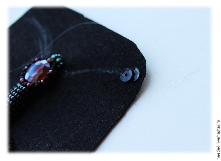Вокруг головки пришиваем пайетки черного и красного цвета, чередуя их, а также заполняем пустоты бусинами-кристаллами и бисером. Тут применяется обычная техника пришивания бусин и бисера, потому, останавливаться подробно на этом этапе я не стала.