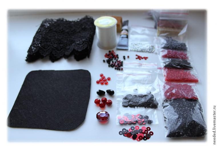 Фетр для вышивки, кружево, бисер № 10 и № 15, пайетки, стразы клеевые (не обязательно), бусины-кристаллы, иглы для вышивки, нить нейлоновая (или какой вы работаете), металлическая фурнитура для броши и колье, троссик, зажимы к нему, плоскогубцы или круглогубцы, клей, кожа, картон.