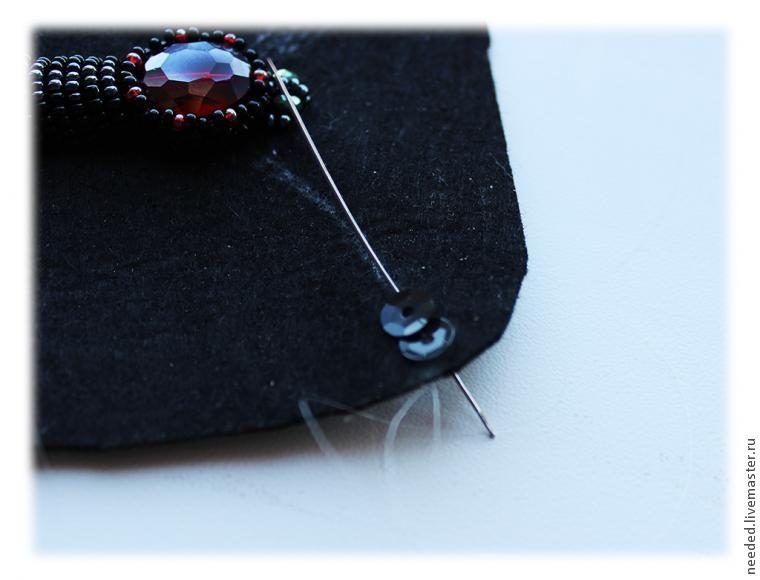 Внизу под линией пайеток делаем обработку бисером № 15, фиксируя край кружева и скрывая мелкие торчащие его детали — они нам ни к чему. Надеваем на иглу 3 бисеринки, и вводим иглу в фетр. Ряды располагаем под углом 45 градусов по отношению к ряду пайеток.