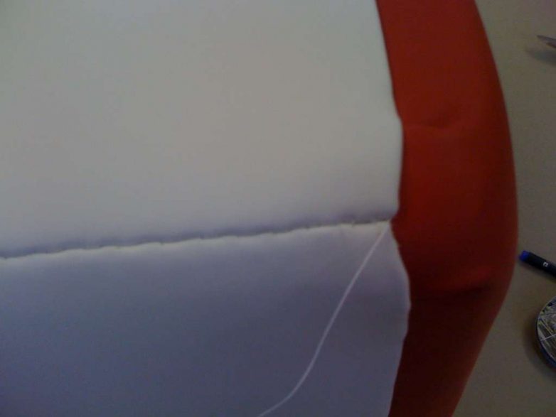 Обейте круглый пуфик по той же технологии, что и квадратный. Сложности могут возникнуть лишь с внутренним углом (уголком рта Пакмана). В этой части нужно будет сделать несколько клинообразных вырезов. Делайте это с максимальной осторожностью, сделав слишком глубокие вырезы, вы испортите всю обивку.