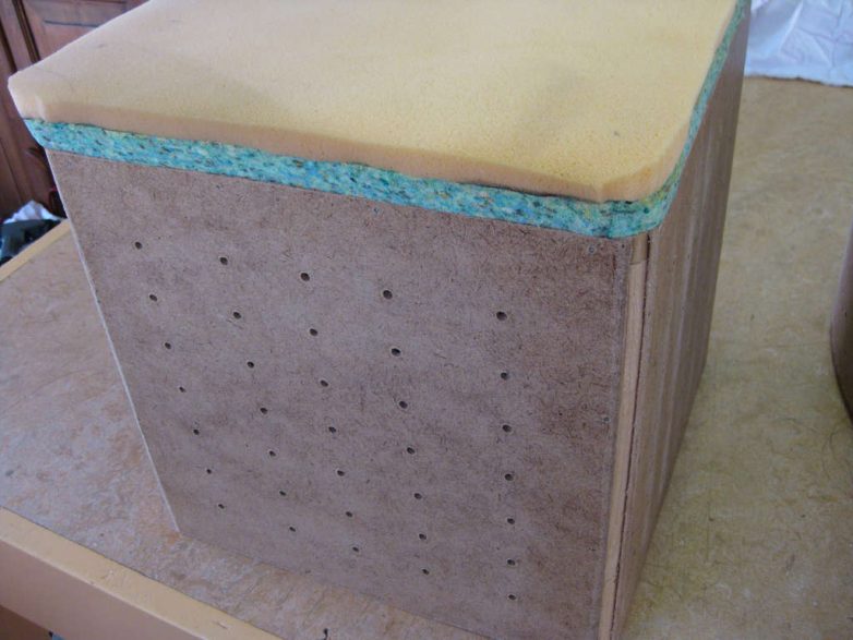 Сделайте обивку квадратного пуфика. Мы советуем начать именно с меньшего пуфика, так как в случае неудачи перетянуть его будет дешевле, чем большой круглый пуф.