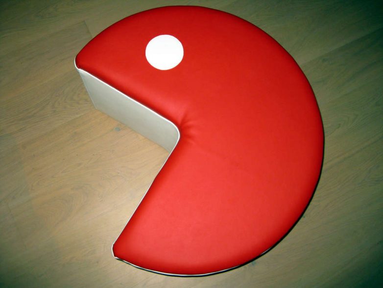 За основу дизайна мы взяли популярную компьютерную игру «Пакман». Пуфик состоит из двух частей, то есть фактически вы получаете два мягких пуфика, которые занимают совсем немного места. Прелесть пуфика Пакмана в том, что его можно установить в углу кровати.