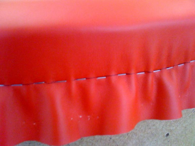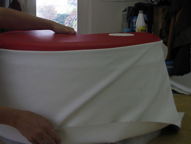 Боковины обтягивают одним сплошным куском дерматина, который оборачивают вокруг и сшивают в одном из углов