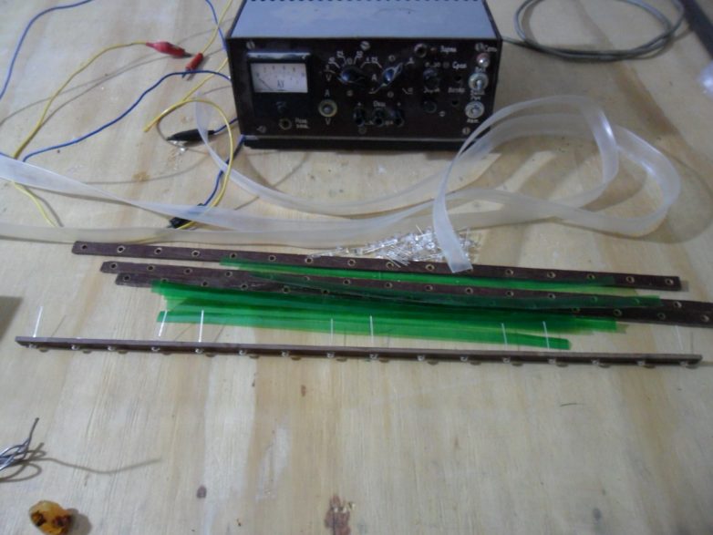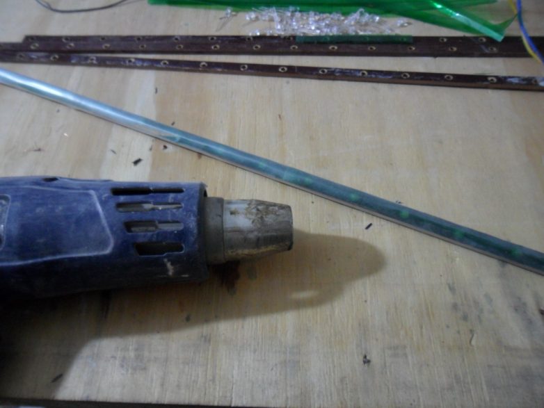 2. Вырезаем из пластиковой бутылки полоски такой же ширины, как и гетинакс. Насверливаем отверстий в гетинаксе под светодиоды диаметром 5мм. В нашей полоске длиной 0,5м было просверлено 16 отверстий.