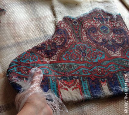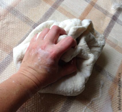 Теперь можно смело катать без сердцевины, заворачивая в полотенце и используя чудесный инструмент рубель. У каждой валяльщицы есть свой набор действий, приводящий к определенному результату. Используем все наработки. Финишную посадку проводим прямо на ноге. На ногу и на руку надеваем пакетики и сажаем по ноге.