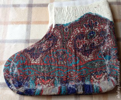 После укатки начинаем формировать сапожок руками, выглаживаем мысочек, пяточку. Выворачиваем чунь наизнанку. Помесим его как тесто. Валяемому должно быть тепло и влажно :)