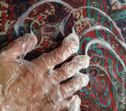 Приступаем к раскладке. Берем первую кучку и выкладываем ее равномерно вдоль шаблона всю без остатка с выступом по краям примерно на сантиметр. Приличные такие облачка получаются :) Поливаем мыльной водичкой. Сеточкой я пользоваться так и не привыкла, и ВШМ тоже не очень люблю. Просто надеваю перчатки и аккуратно промокаю шерсть.