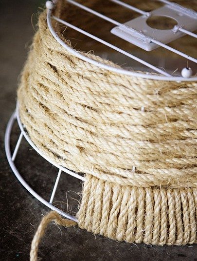 Вот, например, образец прекрасного винтажного абажура в таком теплом деревенском стиле, который сделан своими руками из обычных веревок.