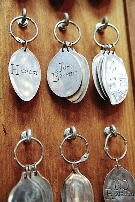 Приборы, прибитые к деревянным блокам, послужат ключками для ключей каждого члена семьи.