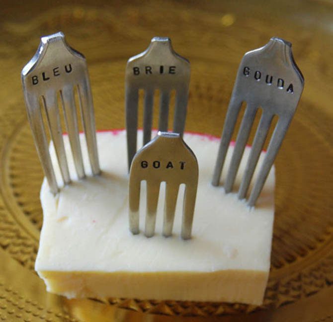 Прекрасные приборы для фуршета получатся из вилок с отрезанными черенками.