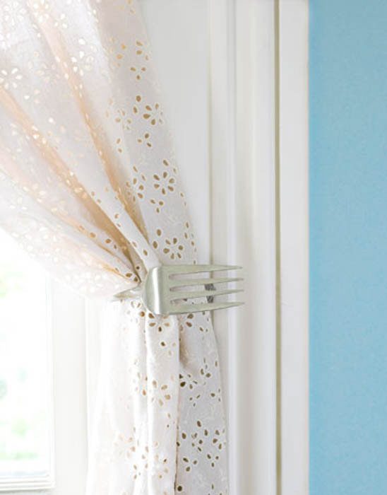 Обычная согнутая вилка станет оригинальным подхватом для занавески. Главное – хорошенько затупить зубцы, чтобы не пораниться.