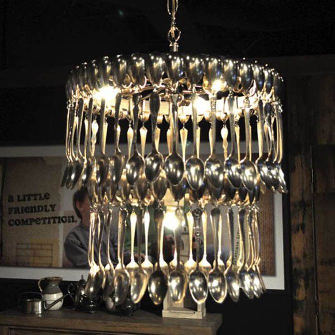 Стильный абажур получится из десертных ножей, ложек и вилок. Для этого нужно освободить старый абажур от ткани и подвесить приборы на тонкие цепочки.