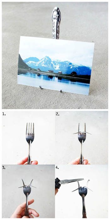 Оригинальная подставка для фотографий получится из вилки с загнутыми зубчиками. Единственный инструмент, который для этого потребуется – плоскогубцы.