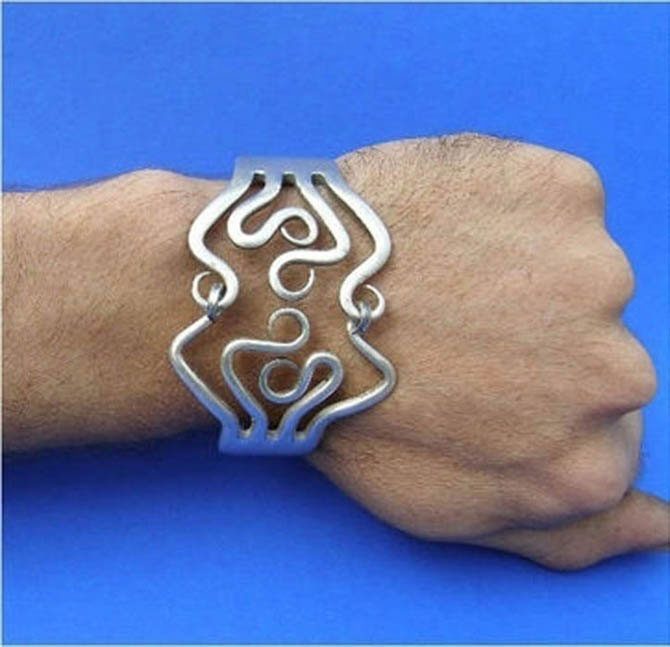 Ещё более сложное украшение, подходящее и для мужчин, получится из двух сцеплённых между собой вилок, с изобретательно завёрнутыми зубчиками.