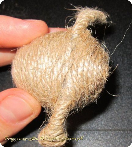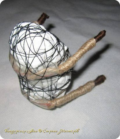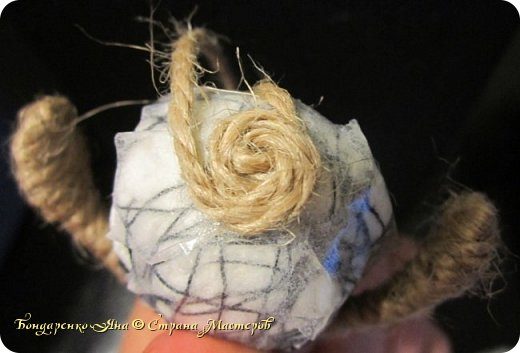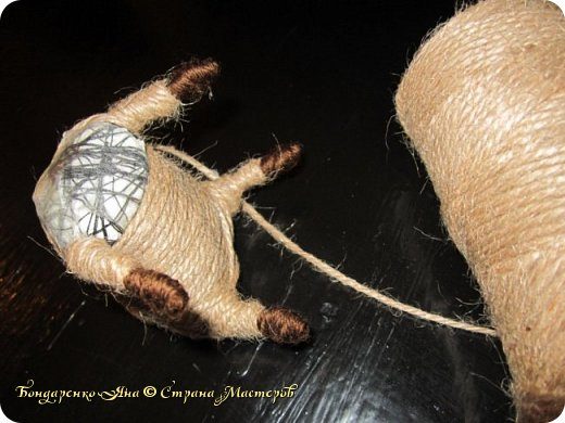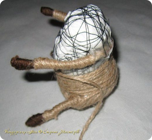 Туловище тоже начинала оклеивать шпагатом снизу, но тут видно что отличаются места крепления ножек и ручек (у овечки «ляшечки» получились полнее).