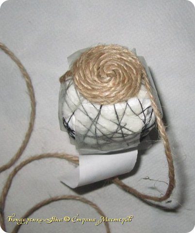 Теперь обмотаем туловище шпагатом. Начнём снизу по спирали, предварительно оклеив тело двусторонним скотчем.