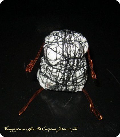 Для того чтобы сделать барашку ножки и ручки нам понадобятся два куска проволоки, которые предварительно мы примеряем к нашему телу, чтоб определить длину. (На фото видно что возле концов проволока немного загнута) Вообще то можно взять проволоку потолще, но у меня такой в наличии не было, потому я просто намотала побольше.