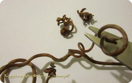 Для шубки нам понадобятся сухие усики виноградной лозы. Обрезаем кудряшки на кончиках усиков: