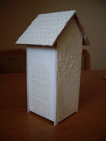 Теперь тонким слоем мазками в разные стороны нанесите шпатлевку на стены домика, имитация штукатурки, местами на стенах прорисуйте зубочисткой кирпичную кладку, которая как бы проглядывает в местах скола штукатурки.