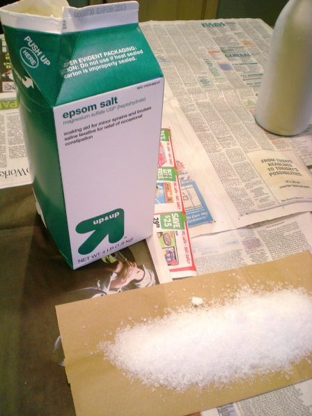 Насыпьте морскую соль горкой на бумагу так, чтобы было удобно прокатывать бутылку.