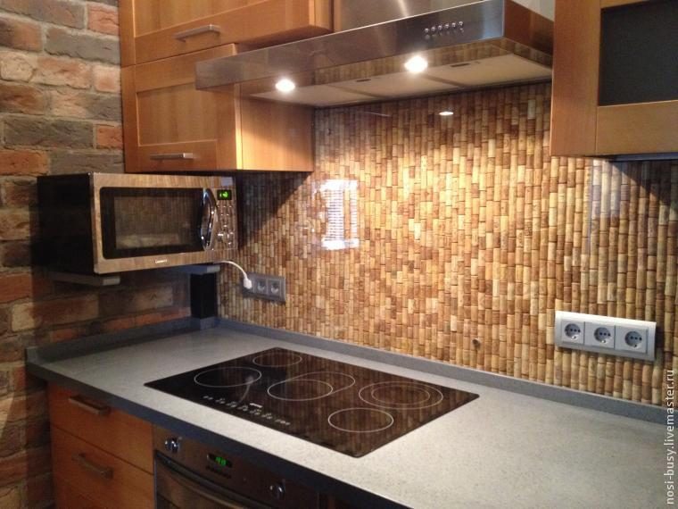 Давно присматривалась к подборкам идей по декору пробками. Вдохновившись, решила (рассказывает автор) не размениваться на маленькие аксессуары, а оформить пробками кухонный фартук. И вот одном из объектов такая возможность появилась!