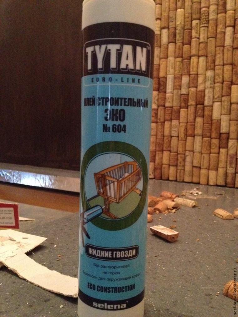 Все пробки разного размера. Чтобы сквозь маленькие щелочки от неплотного прилегания не просвечивала белая стена, мы покрасили ее в темный цвет обычной водоэмульсионной краской. Если интерьер в светлых тонах, то стену можно не затемнять.